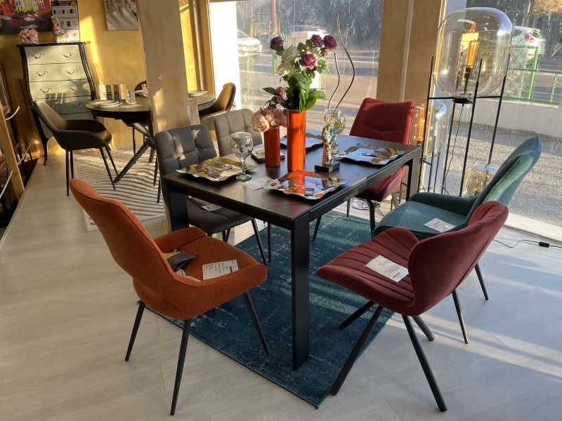 Collection de tables de différentes tailles et formes en verre et céramique piètement acier